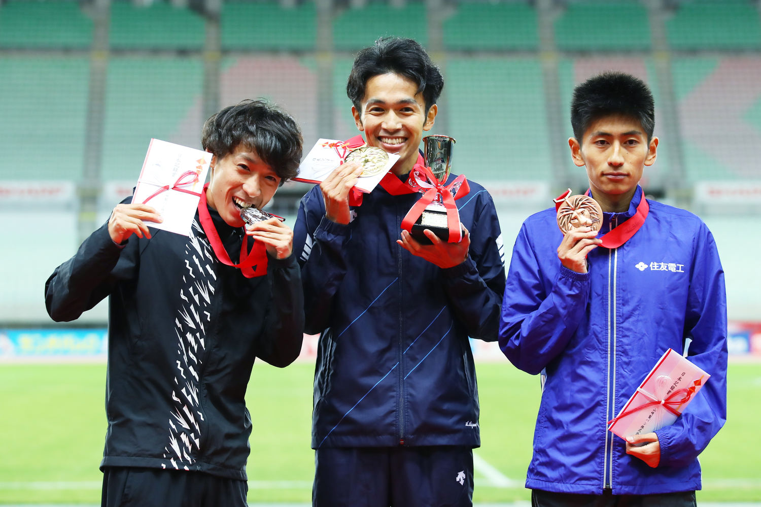 陸上男子1万メートルで日本新記録でゴールした2位 伊藤達彦 左 1位 相沢晃 中央 田村和希 撮影 軸丸雅訓 写真 西日本スポーツ